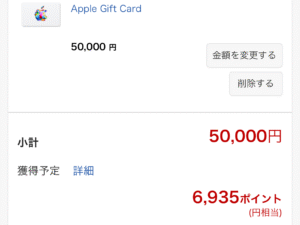 例えば、お買い物マラソン等を活用し14倍の還元を得られている時に5万円分のAppleギフトカードを認定店で購入すると7,000ptの還元が得られる。