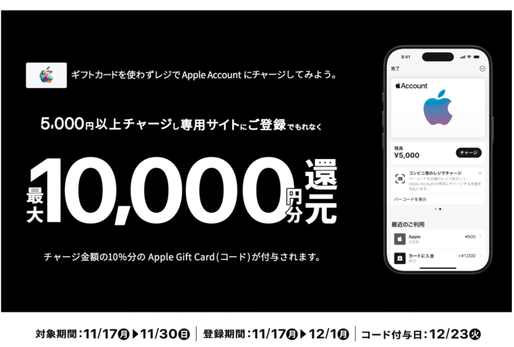 2025年11月30日まで、ファミリーマート・セブンイレブン・ローソンのレジでApple Accountにチャージするとチャージ金額の10%分が還元されるキャンペーンが実施されている。(各社キャンペーンサイトはこちら:ファミリーマート・セブンイレブン・ローソン)